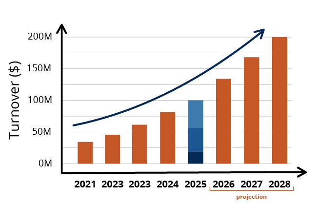 Looking ahead to 2028, our projections target a doubling of revenue (≈ $200 million) through controlled expansion into new markets and the continuous optimization of our supply chain.